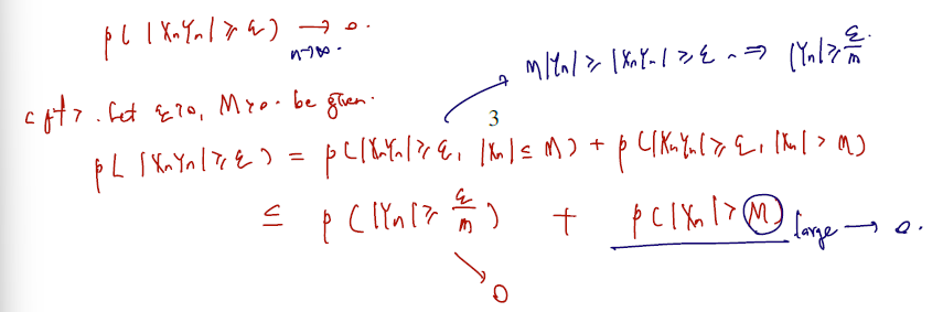 (증명할 성질2) Xn=Op(1) and YnP0⟹XnYnP0 (i.e., Op(1)op(1)=op(1)). -> big-O-p 인 확률유계와 op(1) 인 두 변수를 곱하하면 op(1) 이 된다.
