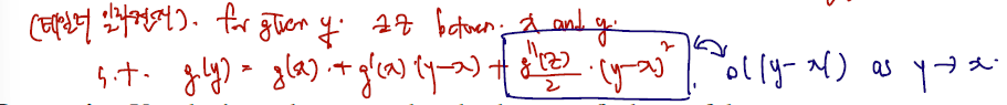 little-o 를 이용하면 테일러 전개에서도 little-o를 포함한 notation 을 쓸 수 있다. 우선 테일러 전개는, 점 y를 근사하는데 x 근처의 y를 써서 이를 x에 대한 식으로 전개함으로 간단히 말할 수 있겠고.. 이때 절편은 g(x), 기울기는 g'(x) 다.