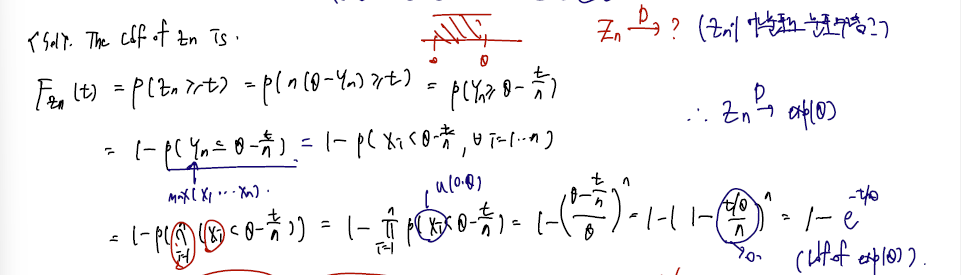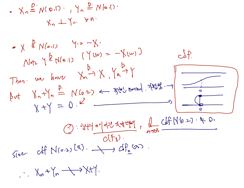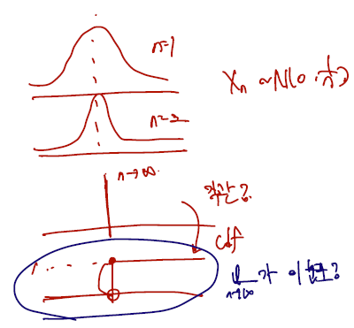 notation 상 중요한 것은 normal(0,1) 의 pdf 를 이상상하면 안되고 cdf 로 수렴함을 명심해야 할 것이다. 예컨대 XnD0 과 같은 notation 이 등장할 경우도 후에 있는데, 이는 0으로 수렴한다는 것이 아니라 0에서 확률이 1이고 나머지가 0인 mass 를 가지는 cdf 로 수렴한다는 notation 이다. 따라서 이런 노테이션이 있다면 0의 좌극한으로는 0으로 수렴하고, 우극한과 함숫값은 1일 것이다.
