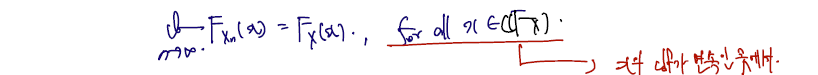 여기서도 마찬가지로 Xn은 확률변수의 sequnce 이고, X는 확률변수이다. 그리고 이들 각각의 cdf 가 존재한다고 하자. (분포수렴이므로 둘 간의 cdf 가 수렴한다고 직관적으로 이해하자.)