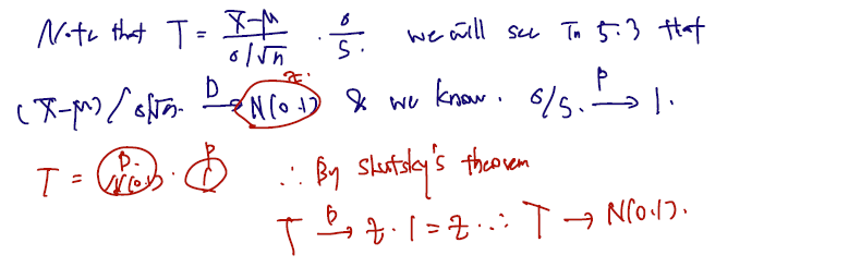 주어진 통계량이 왜 N(0,1) 을 따르는지 (완전한 증명은 아니지만) Slustsky's theorem 을 통해 확인할 수 있다. 표본분산을 모분산으로 갈아끼고 모분산을 표본분산으로 나눈 것을 곱하는 식으로 식을 변형하자. 모분산을 포함한 앞쪽은 N(0,1) 로 분포 수렴한다고 하자. (이에 대한 정확한 증명은 5.3 절에서 다룬다.) 그리고 모분산을 모표준편차로 나눈 것은 in probability 1로 수렴함을 이전에 보였다. 따라서 통계량 T는 Zn 이 normal (0,1) 을 따르는 Z로 분포수렴하는 변수에, An 이 a로 in probability 수렴하는 것을 곱한 것과 같다.