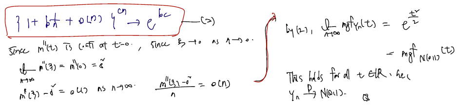 그런데 여기서 rigorous 하게 따져야 할 것이 어떤 상황에서 mgf of Yn이 mgf of N(0,1)로 수렴하냐는 것이다. n이 무한대로 갈 때 mgf of Yn (분포의 극한)이 mgf of N(0,1) 로 수렴한다는 계산이 필요한데, 이것이 convergence in distribution 의 정의였다.