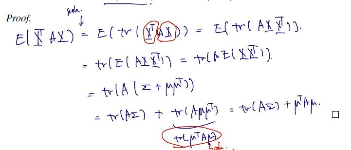 Theorem Suppose the X is a d-dimensional random vector with mean μ and covariance matrix Σ. Then, for a symmetric deterministic matrix A∈Rd×d,
