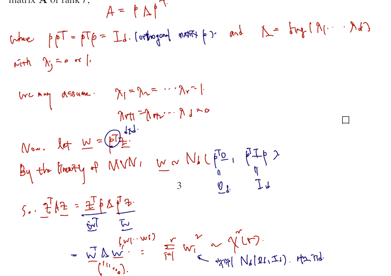 r은 가정으로 eigenvalue 에서 1의 개수이자 tr(A) 를 뜻한다. rank(A) = r 이라면 자연스럽게 A가 들어간 이차형식 역시 자유도 r의 카이제곱분포를 따른다고 정리하면, 되겠다.