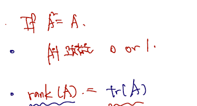 2) rank(A)는 matrix A에서 대각선으로 non-zero 인 eigenvalue 의 개수를 센 것이다. 따라서 A의 대각합으로 볼 수도 있다. (i.e. A의 고윳값이 0 또는 1이므로 합 = 1인 개수와 같다.)