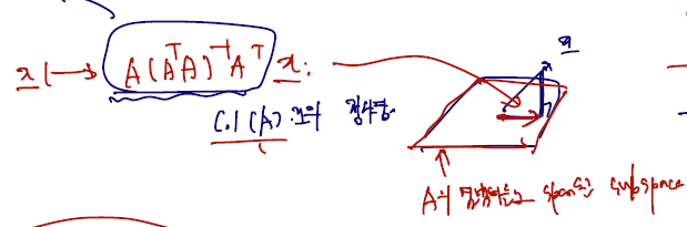 따라서 H:A(ATA)−1AT 라 할 수 있으며 I−H 역시 멱등행렬에 속한다. 여기에 각각 x를 곱하게 되면, 이번엔 Col(A) 로의 정사영이 아닌 Col(A)의 transpose, 즉 직교하는 공간으로의 정사영으로 해석하면 된다.