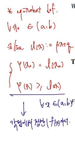 Definition. A function φ defined on an interval (a,b) is said to be a convex (볼록 또는 아래로 볼록) function if for all x,y∈(a,b) and 0<γ<1,