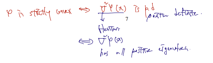 여기서 나아가 φ 가 stricly convex 하다는 것과 동치로 쓰일 수 있는 statement 로 1) 이 함수의 Hessian 이 positive definite 라는 것, 2) hessian 의 eigenvalues 가 모두 positive 라는 것 이 있다.