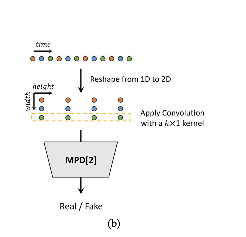 또다른 문제로 speech audio는 다양한 주기를 가진 신호로 구성되기에, audio 데이터에 존재하는 다양한 주기의 패턴을 식별할 필요가 있음. 이를 위해 이 논문은 multi-period discriminaotr (MPD)를 제안함.