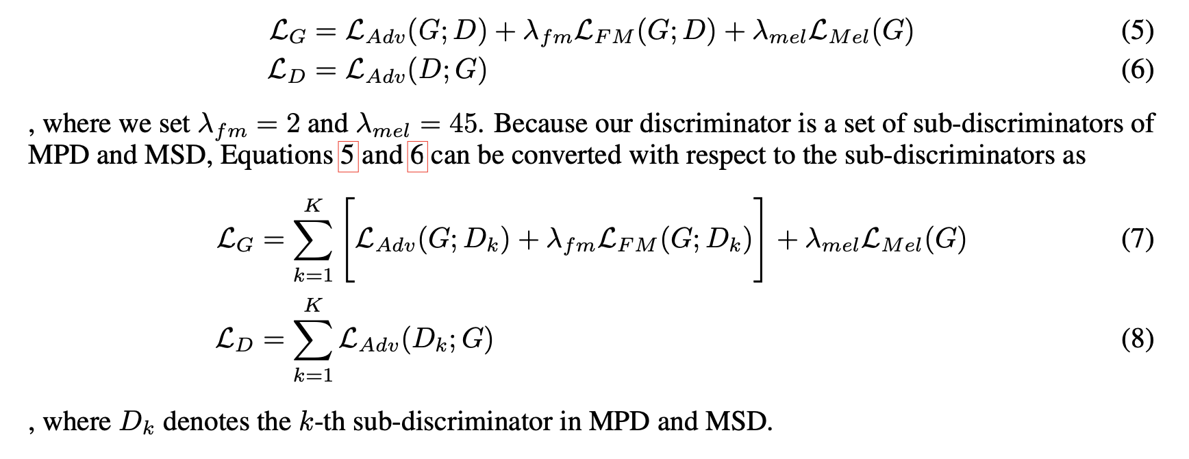1개의 generator과 2개의 discriminator로 구성됨. discriminator는 multi-scale & multi-period discriminator임. generator과 discriminator는 학습 안정성과 모델 성능 향상 위해 2개의 추가적 loss 사용하여 적대적으로 학습함.