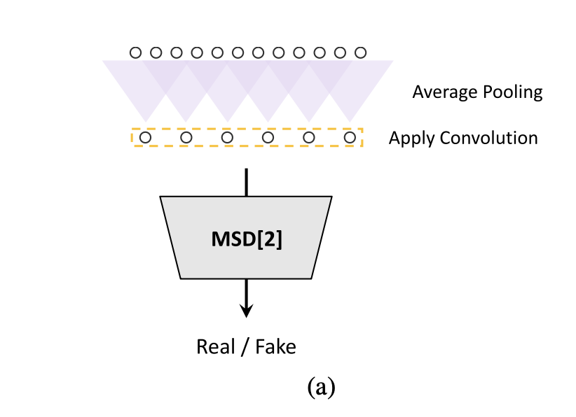 MPD는 여러 개의 sub-discriminator로 구성되고, 각 discriminator는 input auido의 각 주기 신호 부분을 처리함. 또한 연속적 패턴과 long-term dependencies를 포착하기 위해 , 저자들은 melGAN에서 제안한 multi-scale discriminaotr(MSD)를 사용함. 이를 통해 다양한 레벨에서 audio sample을 연속적으로 평가함.