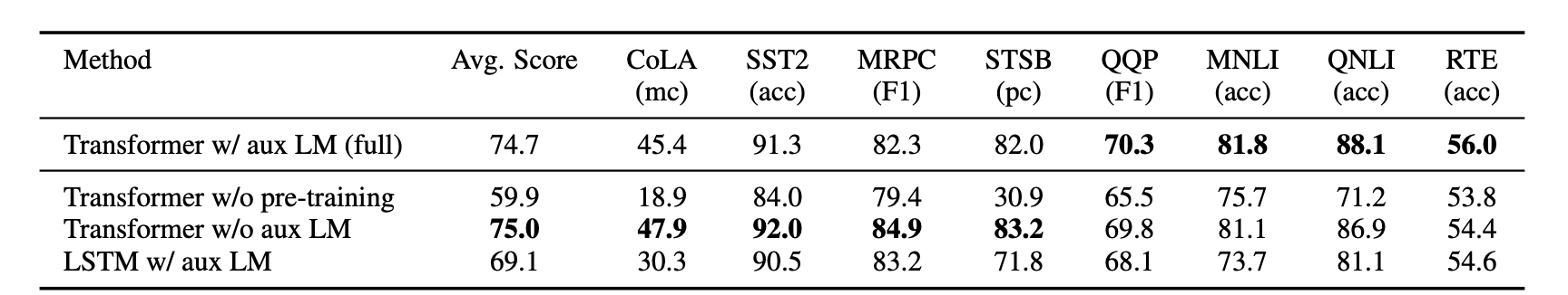 ์ถ๊ฐ์ ์ผ๋ก fine-tuning์ auxiliary objective๋ก LM์ ํฌํํ๋ ๊ฒ์ด, supervised model์ generalization์ ํฅ์์ํค๊ณ , ๋ชจ๋ธ์ด ๋น ๋ฅด๊ฒ ์๋ ดํ๋๋กํ์ฌ ํ์ต์ ๋์์ด ๋จ์ ํ์ธํ์์.