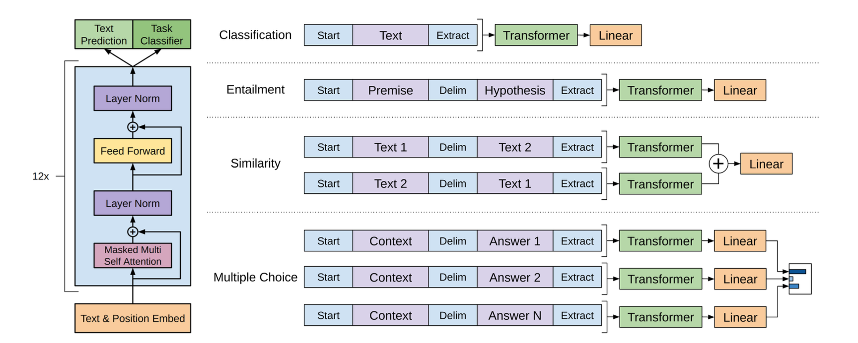input tokens ์ ํด๋นํ๋ label y๋ฅผ ์์ธกํด์ผ ํ ๋, ์ ๋ชจ๋ธ์ ๋ง์ง๋ง ํธ๋์คํฌ๋จธ ๋ธ๋ก์ activation ์ input์ผ๋ก ํ๋ linear layer๋ฅผ ์ถ๊ฐ