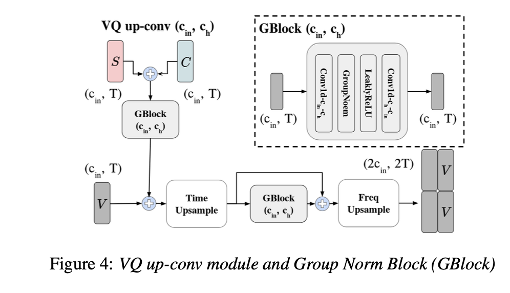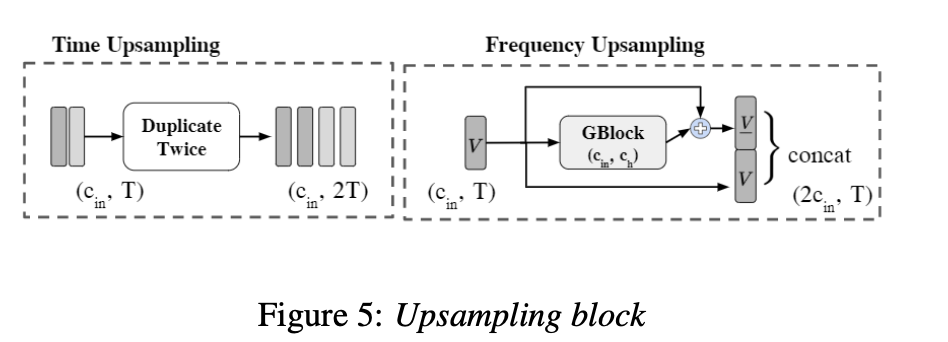 - 3๊ฐ์ง ๋ฉ์ธ ์์๋ค์ธ Group Norm block(GBlock) , TimeUpsampling, FreqUpsampling