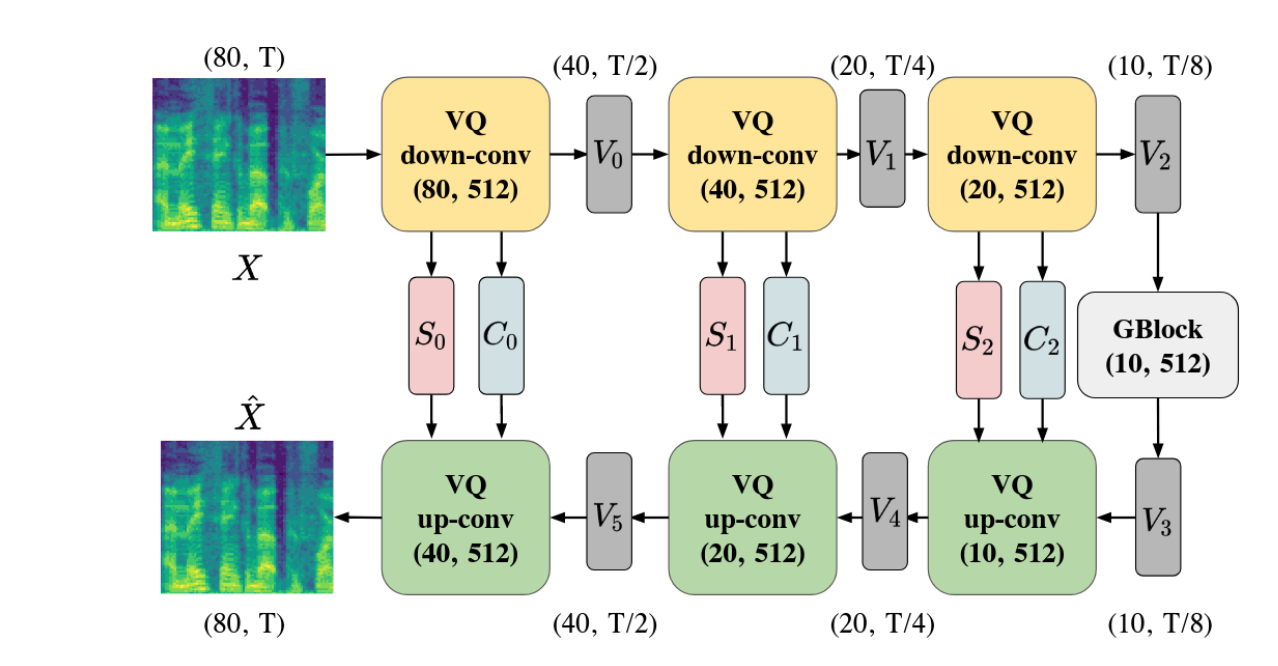 - ์ด์ค V๋ ๋ค์ VQ down-conv ๋ชจ๋๋ก ์ ๋ฌ๋๊ณ , C, S๋ ๋์ฝ๋์ ํด๋น VQ up-conv๋ก ์ ๋ฌ๋จ๋ค