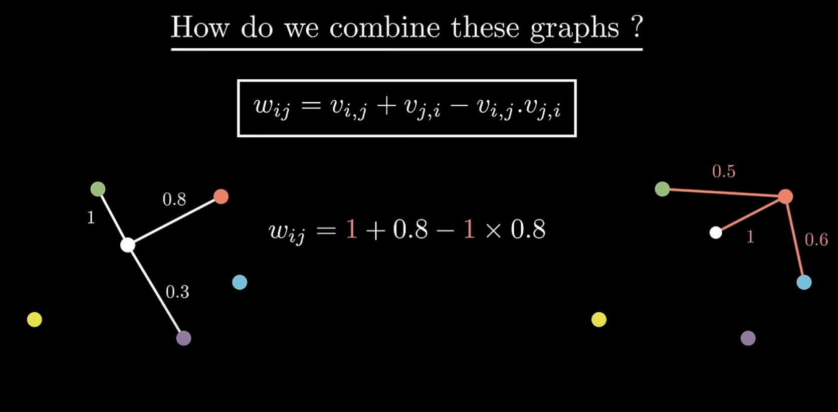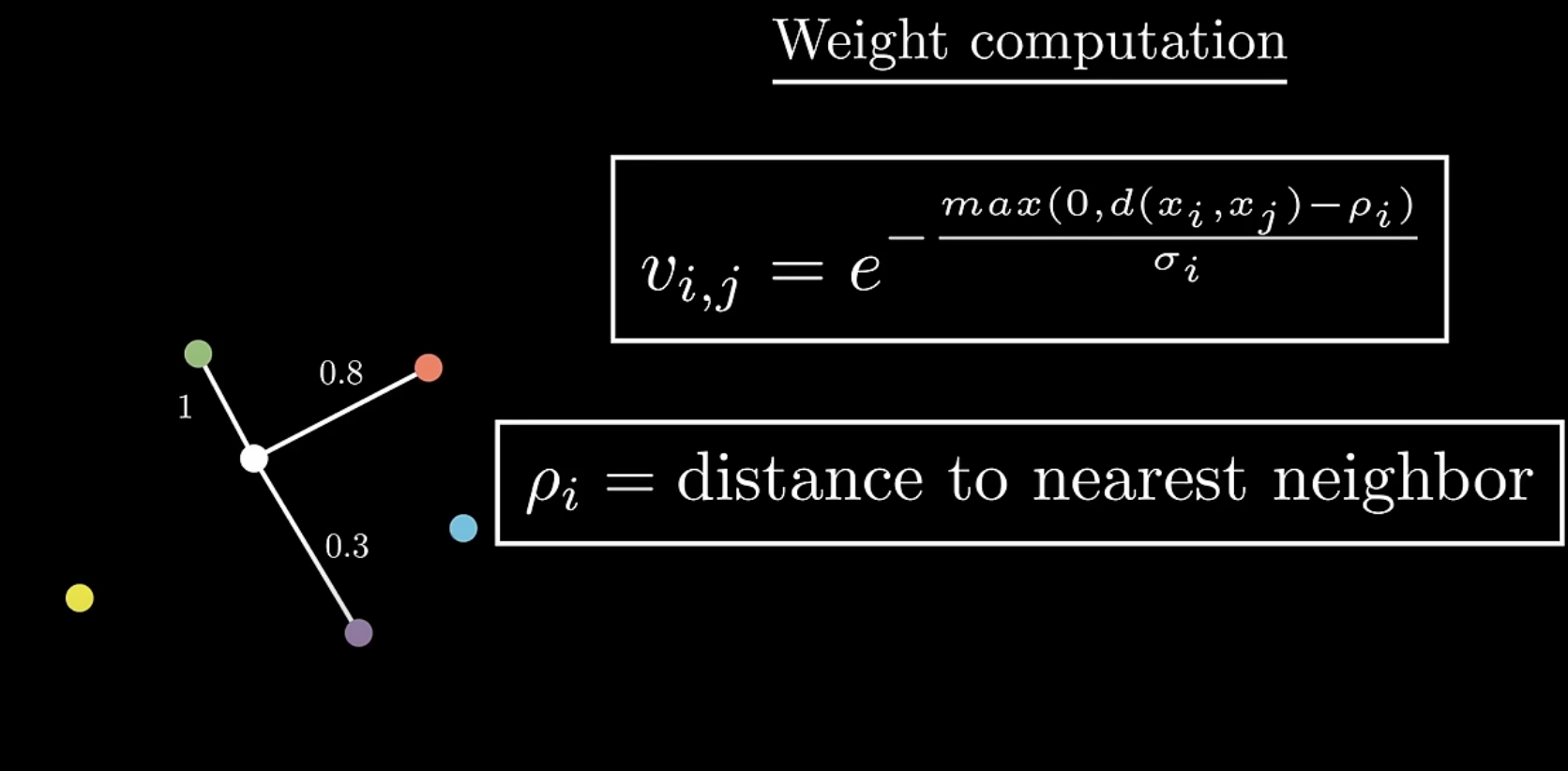 ๊ฐ์ฅ ๊ฐ๊น์ด ์ด์์๋ ์ต๋ ๊ฐ์ค์น(1)๋ฅผ ํ ๋นํ๋ฉฐ, ๊ฑฐ๋ฆฌ์ ๋ฐ๋น๋กํด ๊ฐ์ค์น๊ฐ ๊ฐ์ํ๋ค. ์ด๋ t-SNE์ ์ ์ฌํ ๊ณต์์ด์ง๋ง, UMAP์ ๊ฐ์ ์ ๊ทํํ์ง ์์ ๊ณ์ฐ ์๋๊ฐ ๋ ๋น ๋ฅด๋ค.