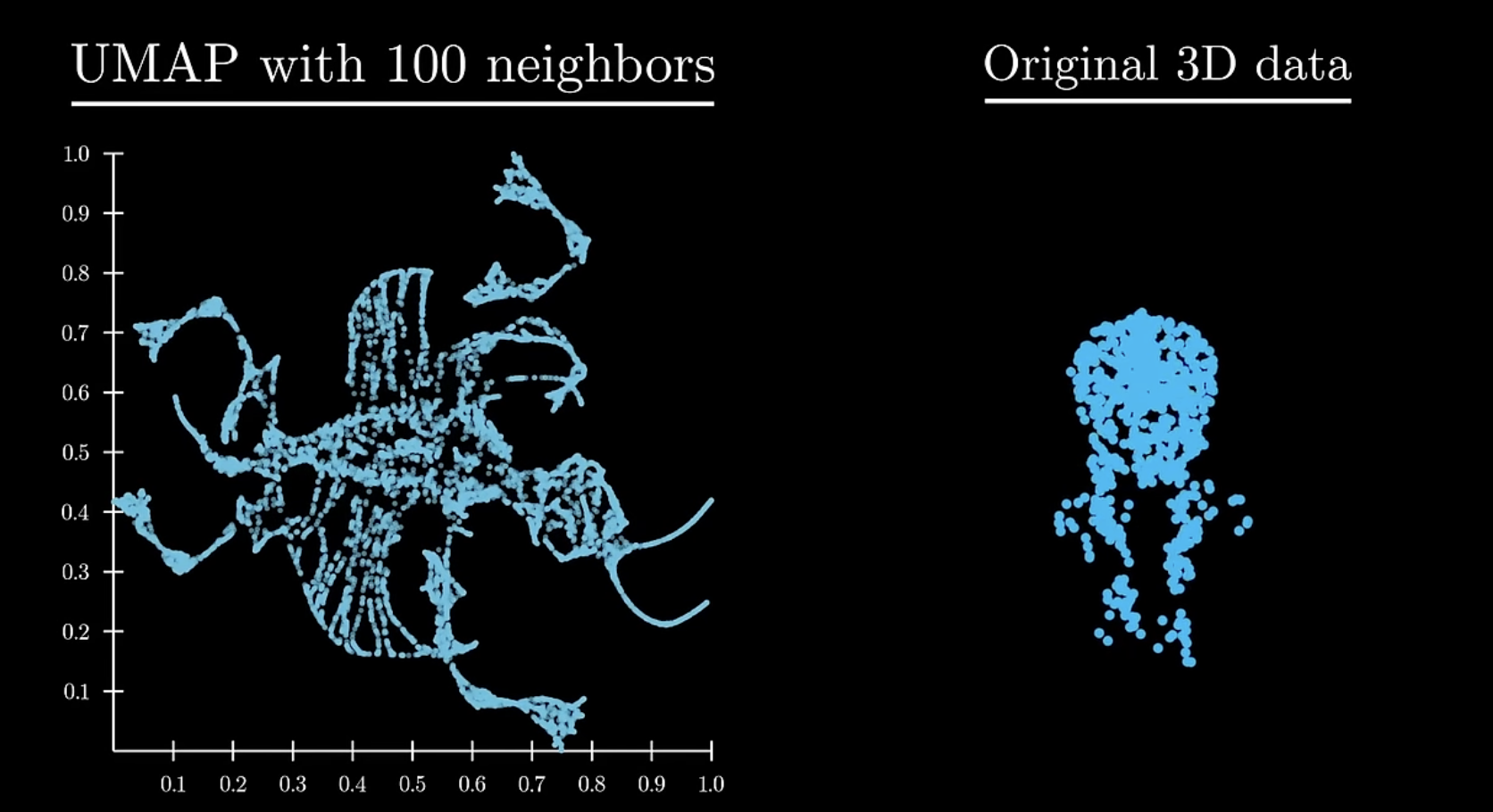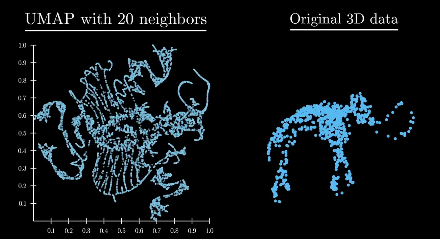 UMAP์ ๋ ๋ค๋ฅธ ์ฅ์ ์ ์ด๊ธฐ ๊ทธ๋ํ ๊ตฌ์ฑ์์ ์ฃผ์ ํ์ดํผํ๋ผ๋ฏธํฐ์ธ number of nearest neighbors์ด๋ค.