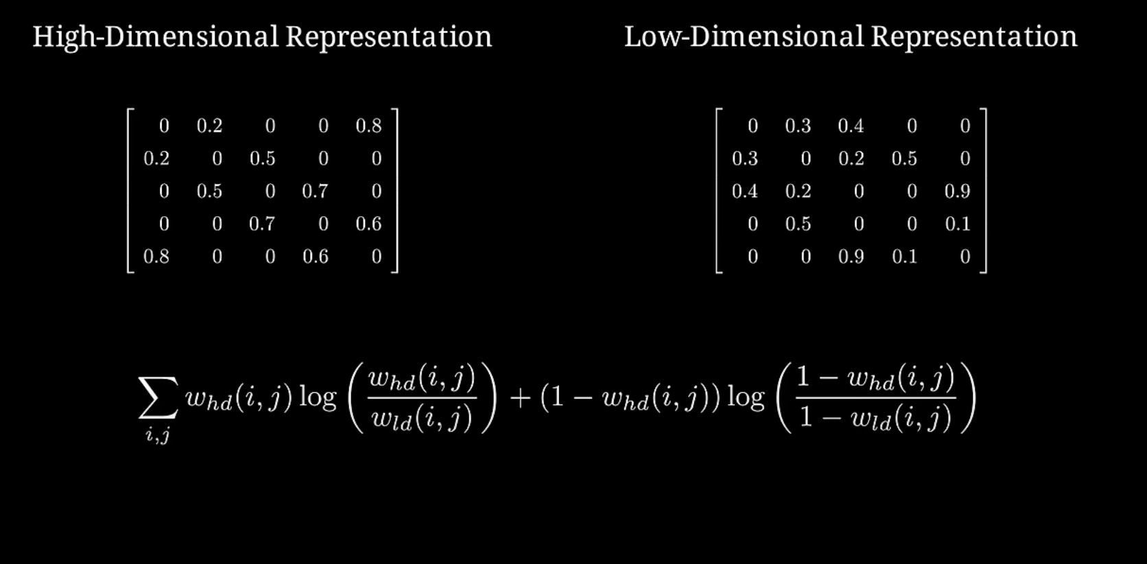 ์ด ์๊ณ ๋ฆฌ์ฆ์ ํต์ฌ์ t-SNE์ ๋ค์ ์ ์ฌํ๋ค.