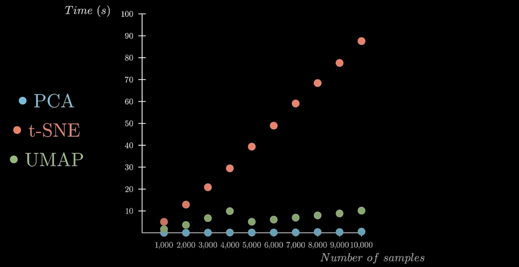 UMAP์ ๋ฐ์ดํฐ ํฌ๊ธฐ์ ๋ฐ๋ผ ๋ฐํ์ ์ฆ๊ฐ์จ์ด t-SNE๋ณด๋ค ํจ์ฌ ๋๋ฆฌ๋ฉฐ, ๋๊ท๋ชจ ๋ฐ์ดํฐ์