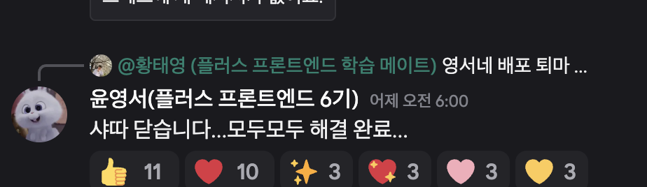 어쨌거나 내가 노션을 만들었기 때문에 책임도 내가 져야한다는 생각에 그 분의 배포를 책임지게 되었는데...갑자기 전챗에 내가 들어가 있던 팀이 배포 맛집이라며 소문이 난다..