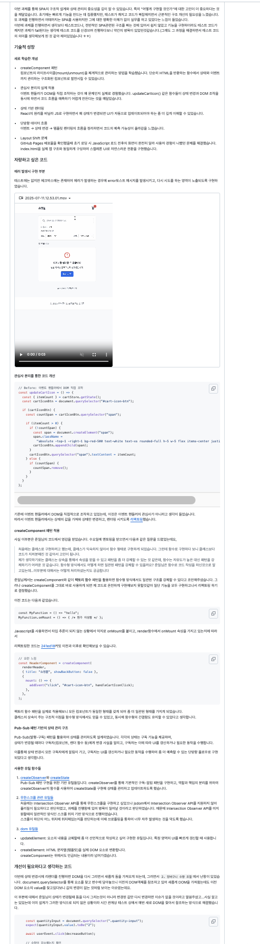 처음에 1주차 과제를 시작할때 어떻게 과제를 할지에 대한 설계를 먼저 해야겠다 하고 시작했더니 공통 유틸이나 전반적인 SPA 구조에 대한 감이 왔고 그렇게 차근차근 세워가다보니 비교적 빨리 기본과제랑 심화과제가 끝났다.(그래봤자 목요일임 ㅋㅋ) 아무튼 그래서 리팩토링이나 PR쓸만한 시간도 빨리 확보가 됐고, 배포에 대한 시간도 빨리 확보가 됐던 것 같다.