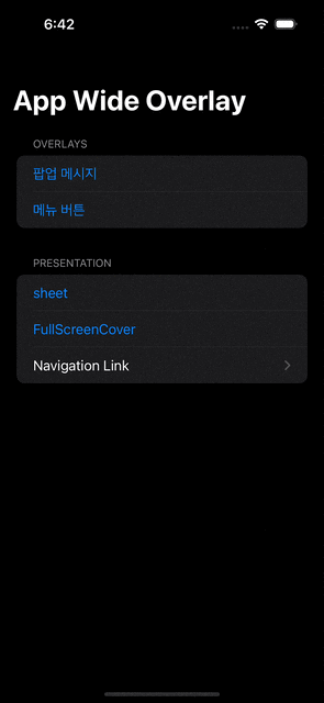 안녕하세요 L3C4Y4입니다. 이번 포스팅에서는 위 영상처럼 SwiftUI앱의 뷰 계층구조에서 가장 위에 오버레이를 띄우고 싶을 때가 있는데요. 그 방법에 대해 정리해보았습니다.