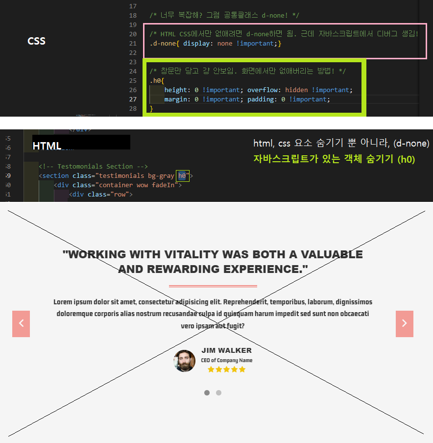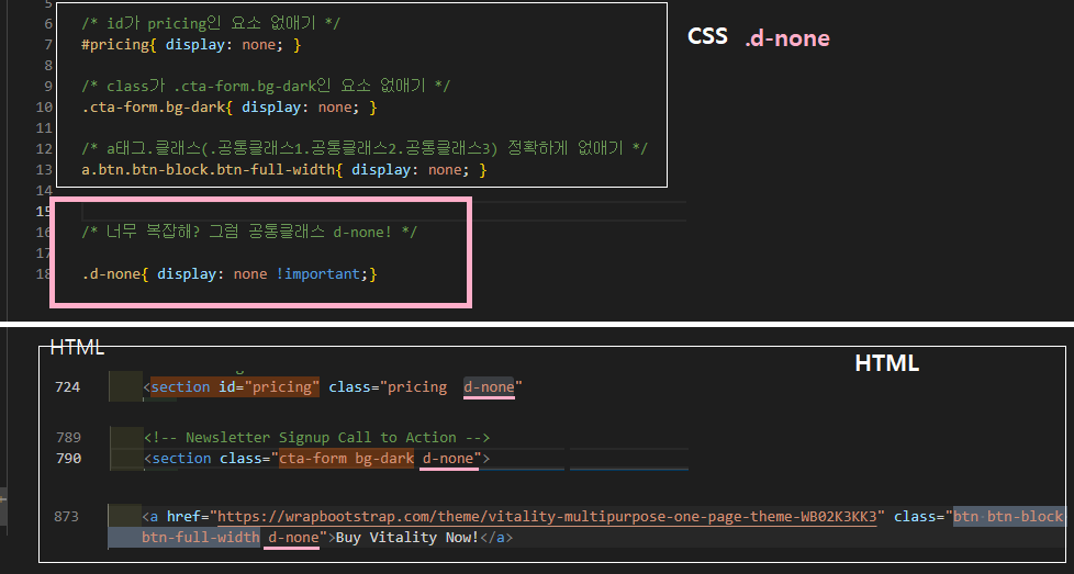 HTML CSS에서만 없애려면 d-none(제거)하면 됨. BUT 자바 스크립트에서 디버그 생김!!