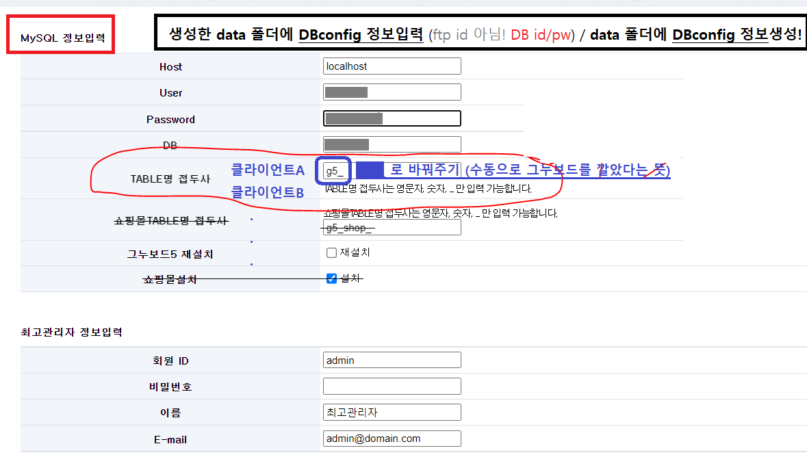 MySQL 정보와 최고관리자 정보를 입력합니다.
