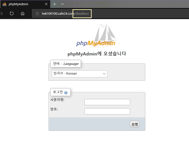 먼저 웹브라우저를 열고, 주소창에 http://www.도메인주소/dbeditor 를 입력후 엔터키를 누르면 아래와 같은 화면이 나타납니다.