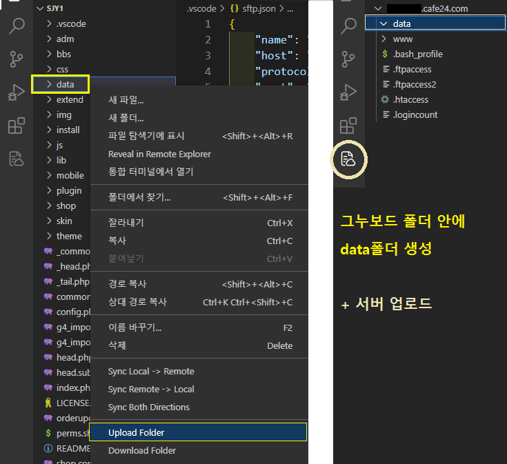 그누보드 폴더(common.php파일이 있는곳/=sjy1) 안에 data폴더 생성 +서버upload
