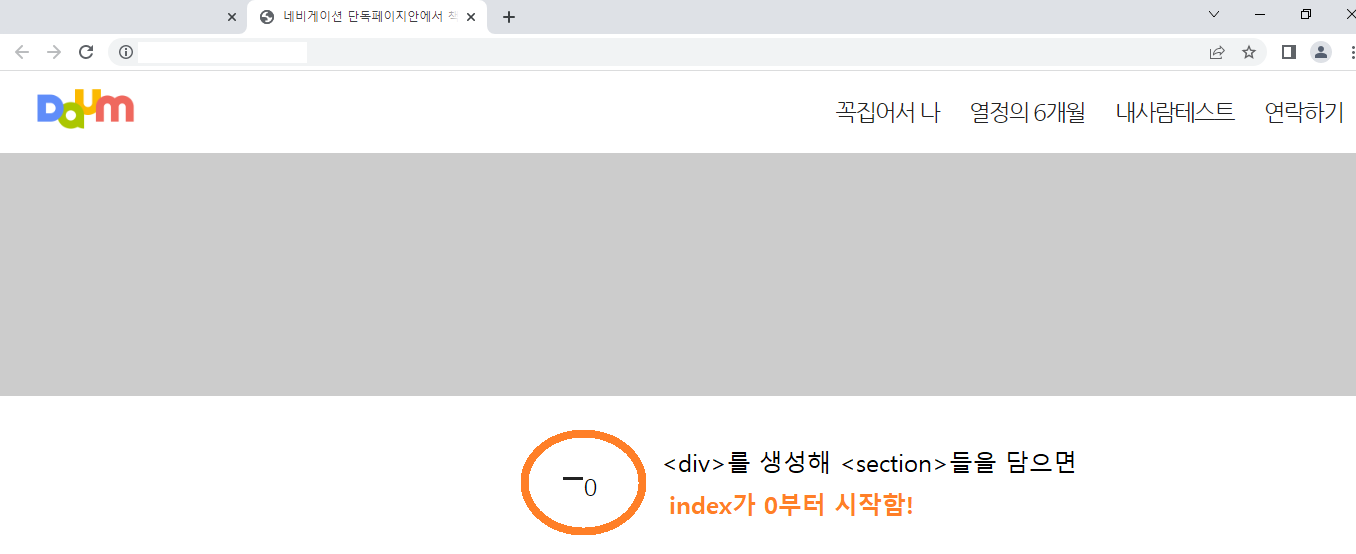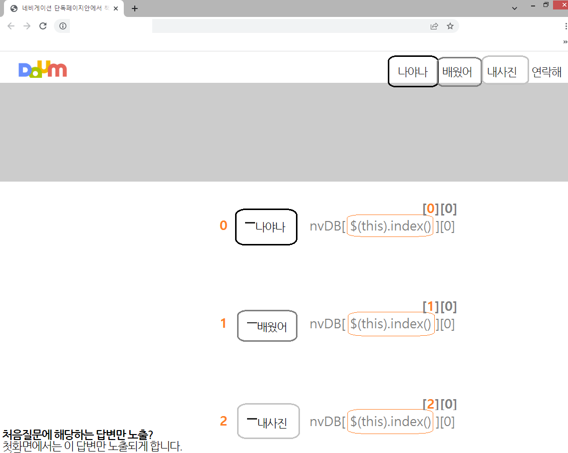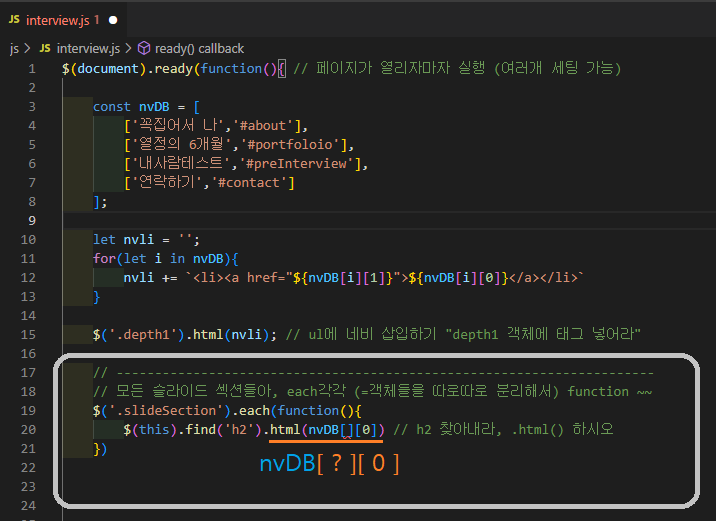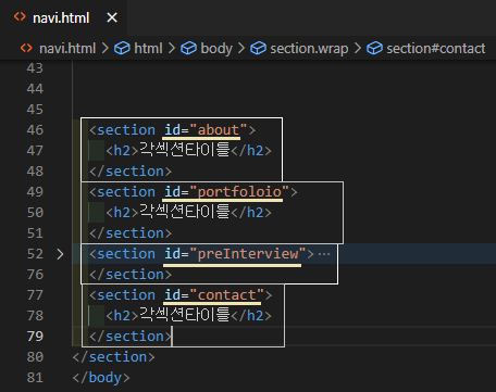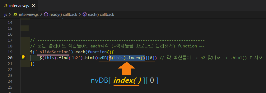 // 각 섹션들아→ h2 찾아서→ .html에 (nvDB[?][0]) 노출해