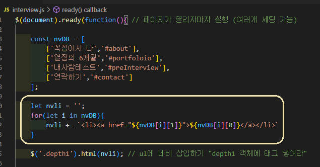 $('.depth1').html(nvli); // ul에 네비 삽입하기 "depth1 객체에 태그 넣어라"