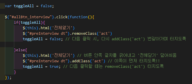 toggleAll = false; // 다음 클릭 시, 다시 addClass('act') 번갈아가며 터지도록