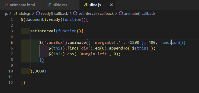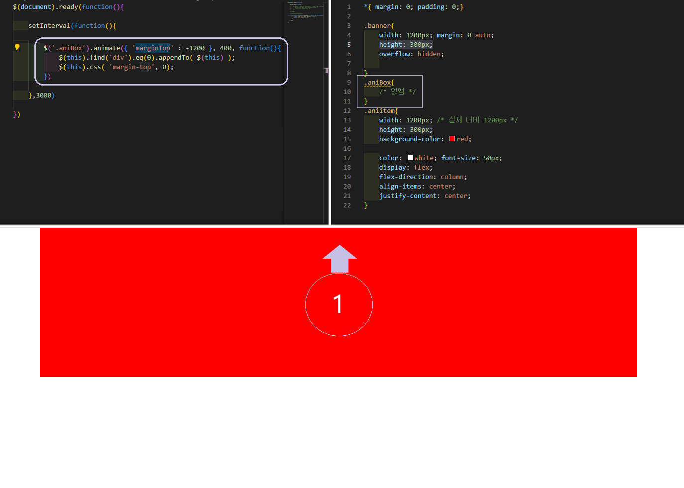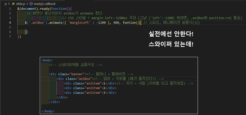 즉, "화면이 열리자마자 .aniBox가 'marginLeft' : -1200' 위치로 animate,