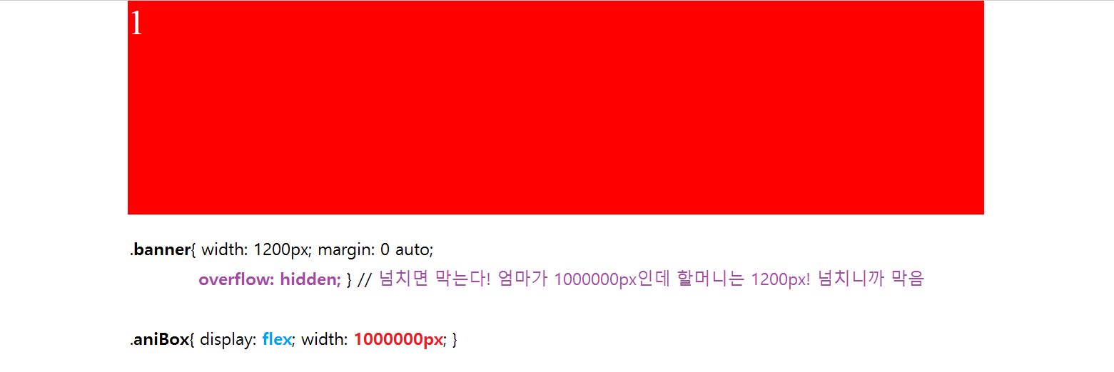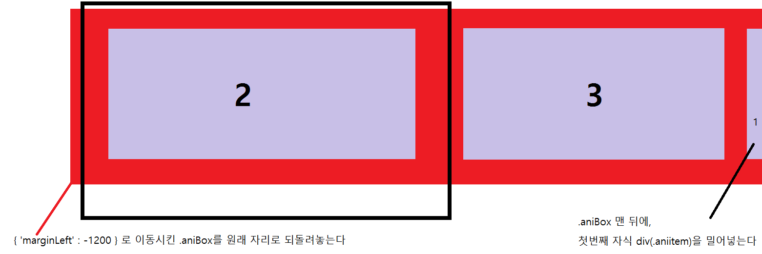 ② { 'marginLeft' : -1200 } 로 이동시킨 객체(.aniBox)를 원래 자리로 되돌려놓는다