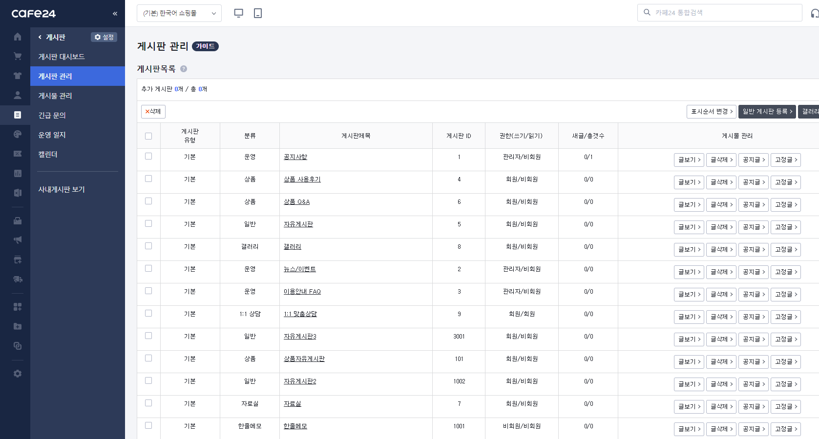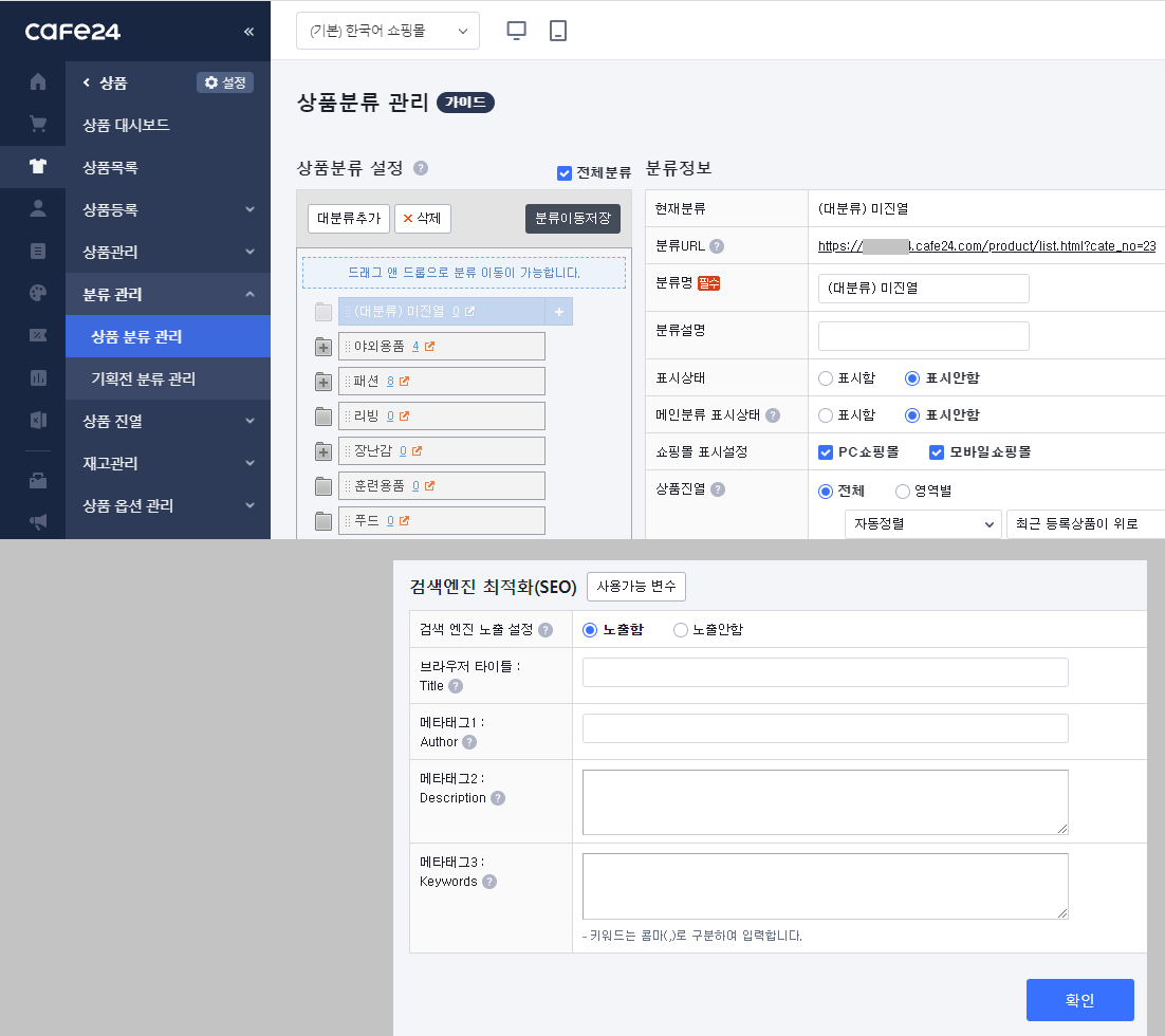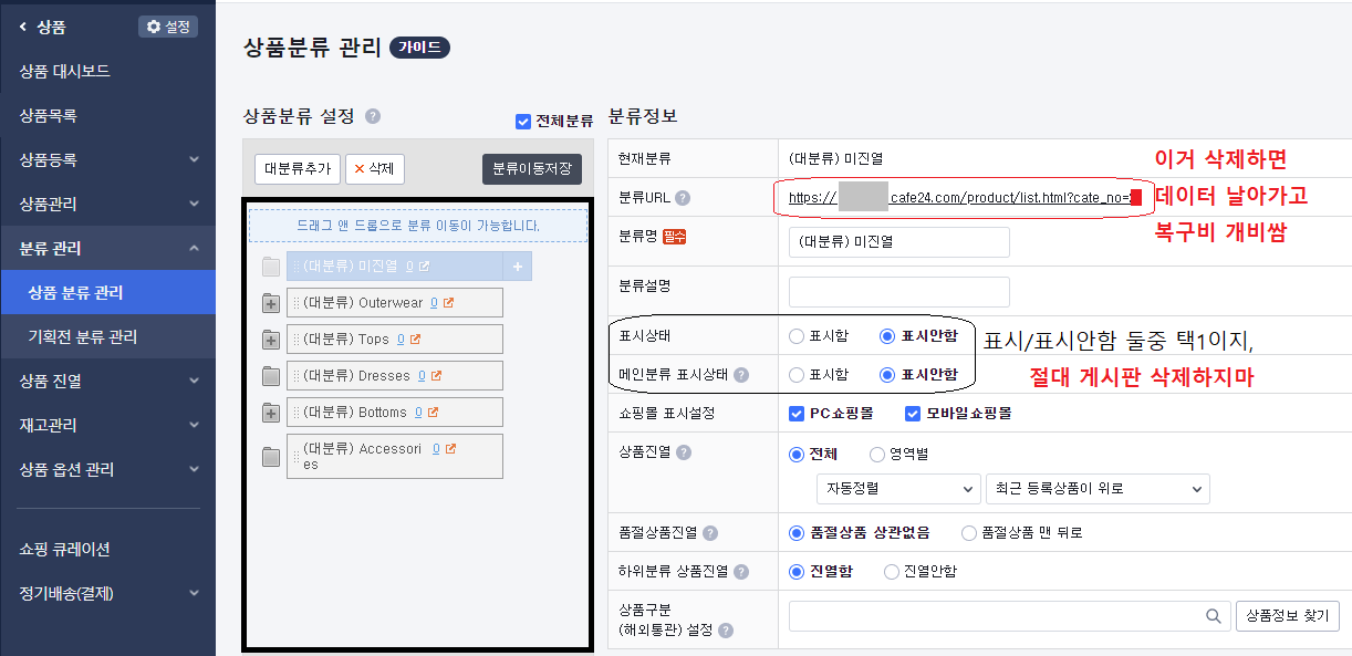게시판 절대 삭제하지마!!! 상품카테고리 분류번호 cate_no는 두번다시 생성되지않는 것으로, 절대절대 분류삭제NO -> '수정 및 노출안함' 등으로 재탕삼탕해서 써야한다.(꼭 기억하기)