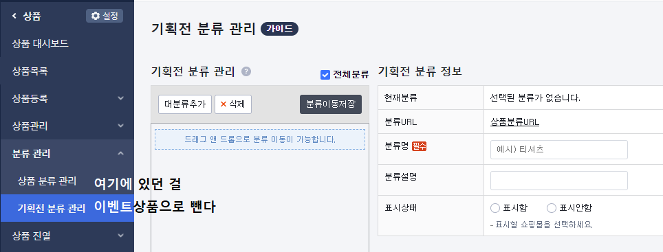 상품 분류 관리에 있던 걸 기획이벤트 상품으로 뺀다 (없어져도 되는 것)