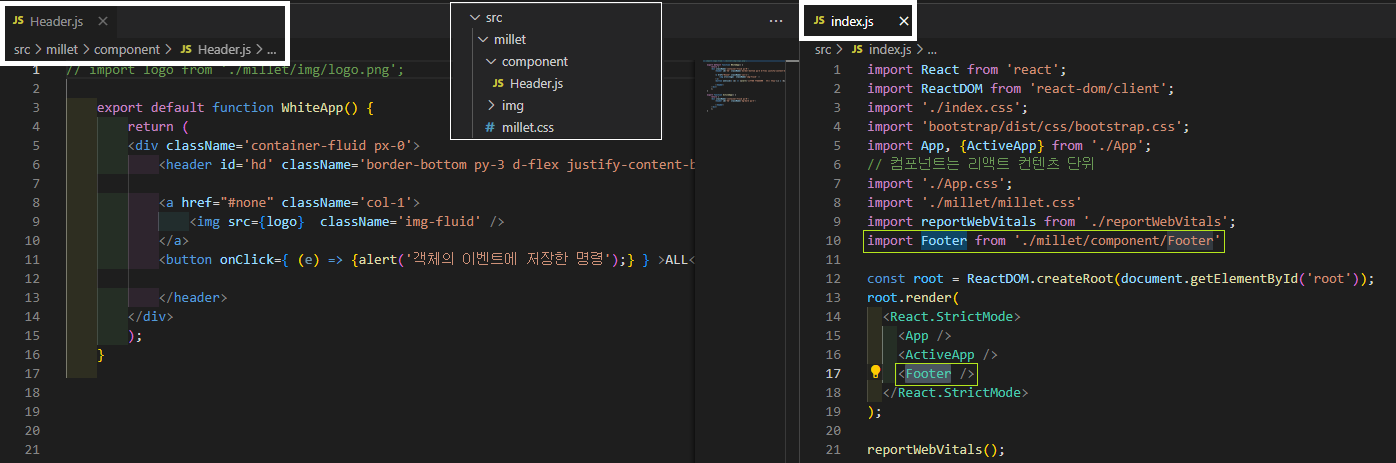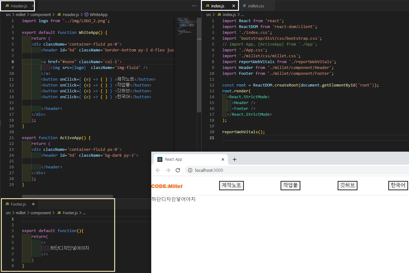 - 리액트로 Header & Footer 컴퍼넌트 생성 ( index.js에 임포트 )