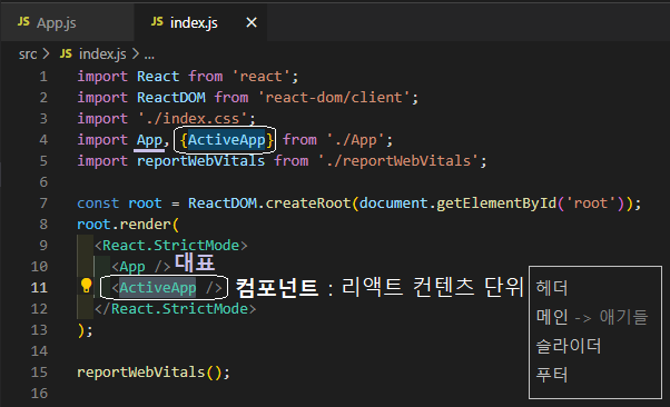 ㄴindex.js 확인하면, App이라는 명함들고 돌아다님. 대표는 자유롭다!