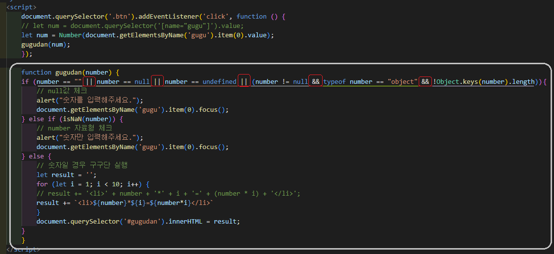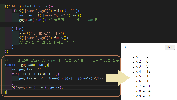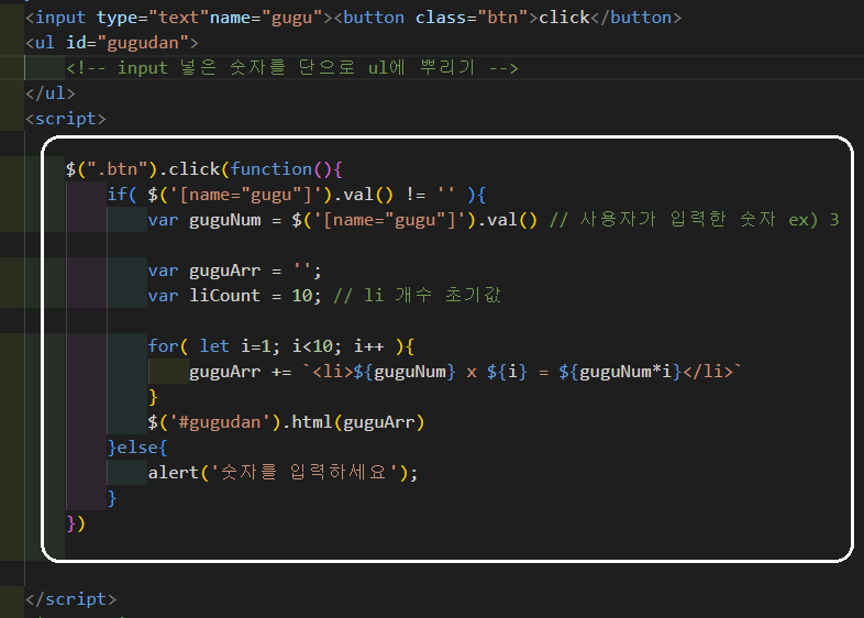 input에 넣은 숫자를 < li >구구단< /li >으로 작성해 ul에 뿌리기 (for문)