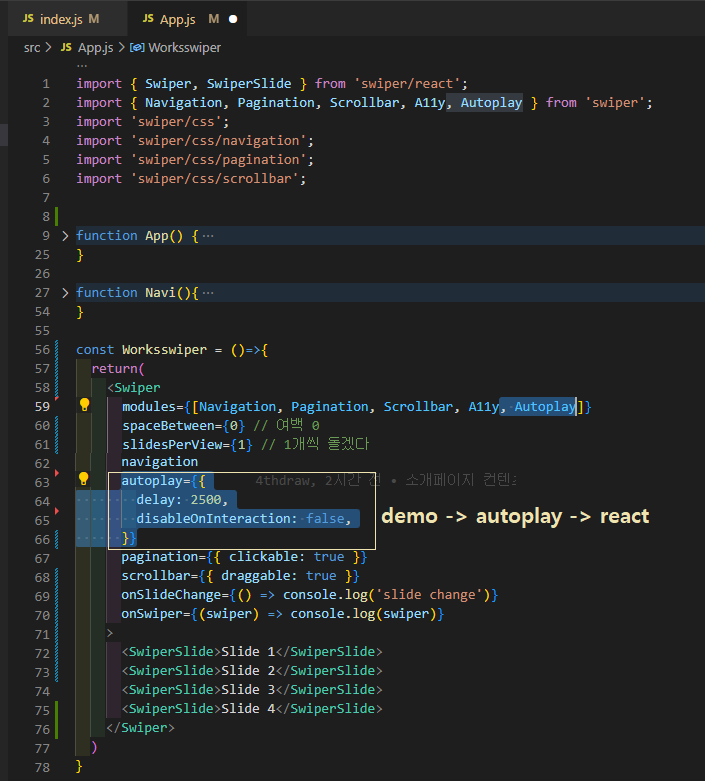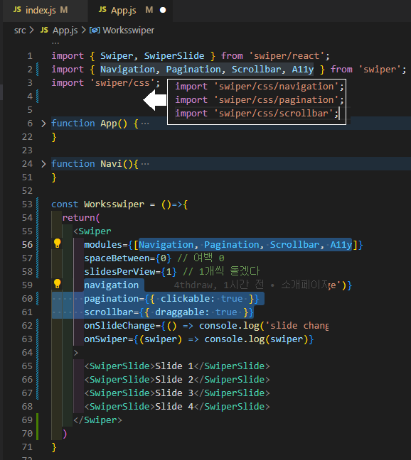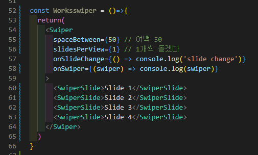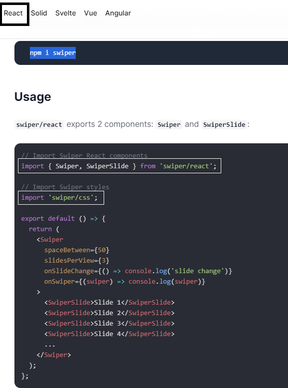 https://swiperjs.com/react 에서 설치식 및 사용법 확인