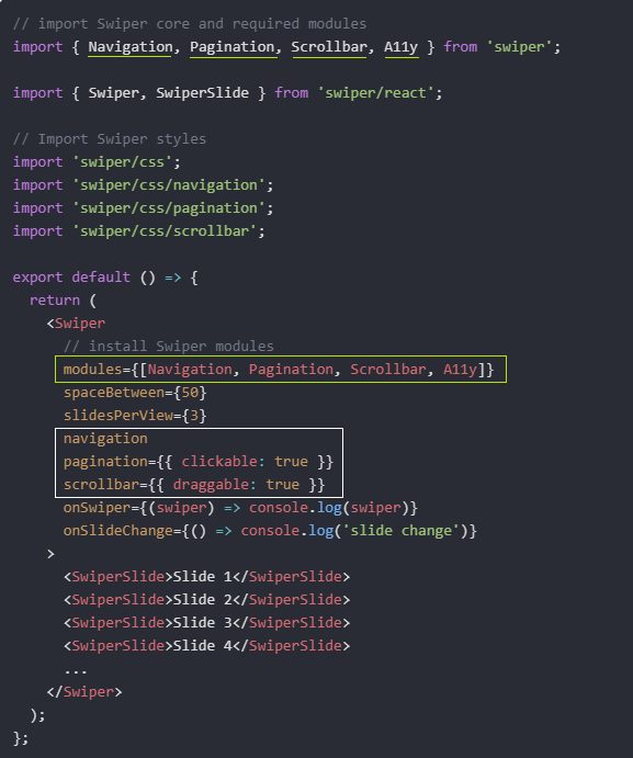 modules={[Navigation, Pagination, Scrollbar, A11y]}