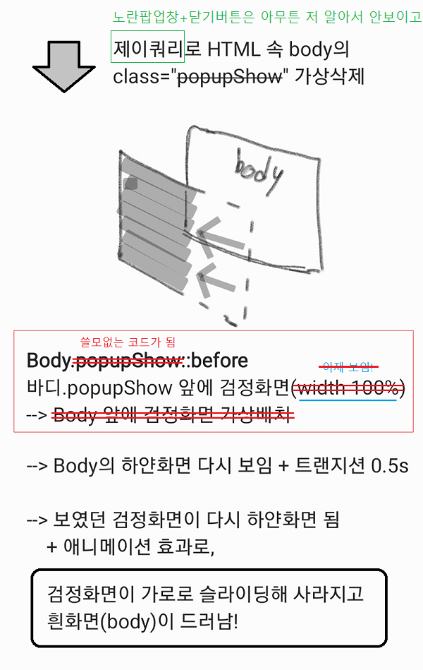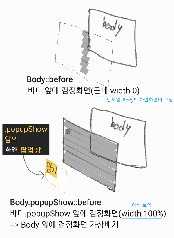 즉, Body::before/바디 앞에 검정화면 (근데 width: 0 이라서 보이지 않음)