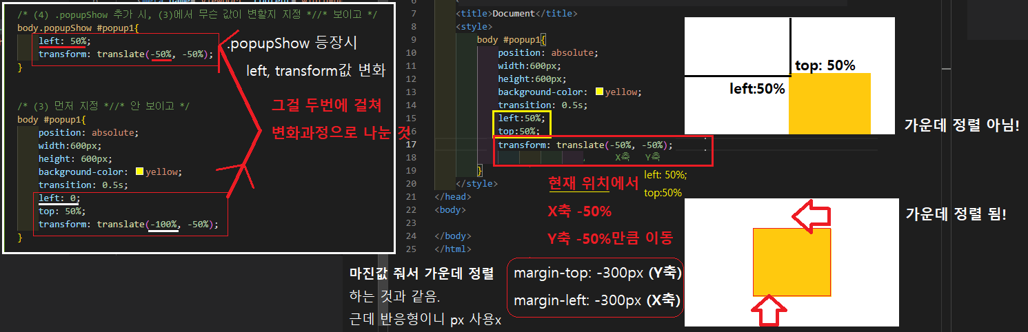 +) transform: translate(-50%, -50%); = 마진값 줘서 가운데 정렬하는 것과 같음