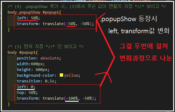 (4) body.popupShow #popup1 - /보이고/ .popupShow 추가 시, (3)에서 무슨 값이 변할지 추가 지정