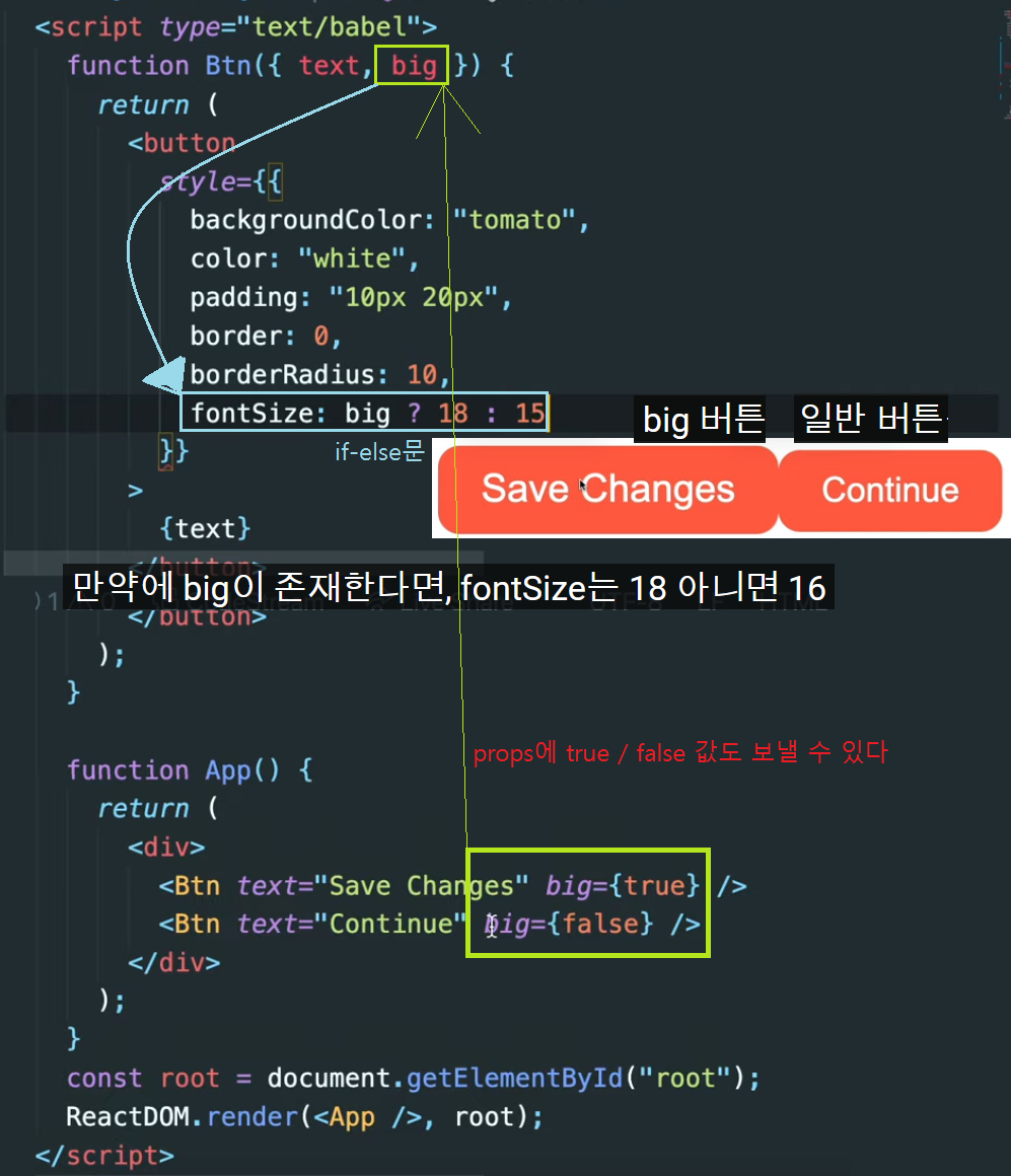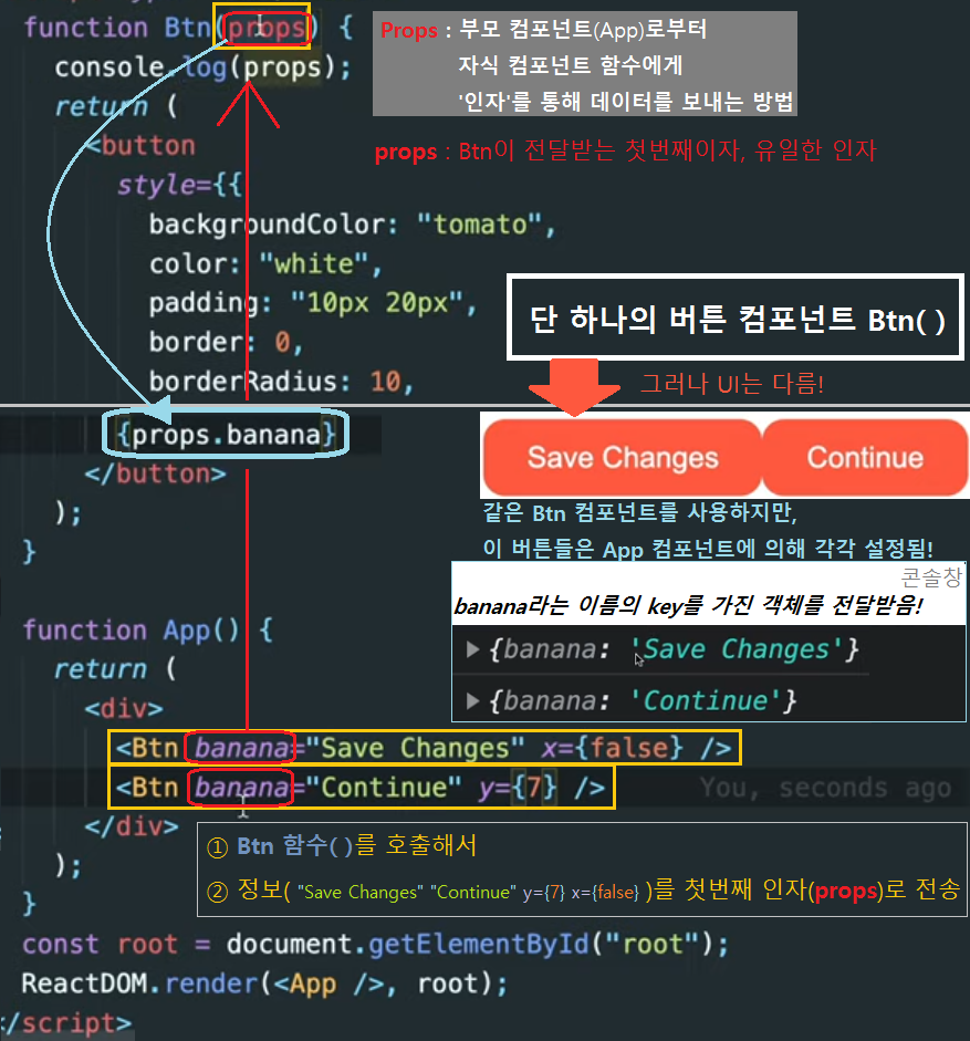 ① App 함수에서 Btn( )를 호출 → text 인자(=props)를 Btn( )에 전달