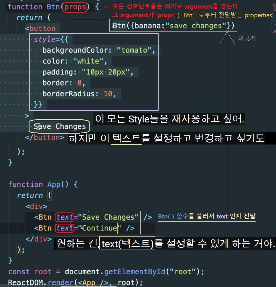 ② Btn 함수는 전달받은 {모든 정보}를 객체에 담아, 첫번째 인자(=props)로 받아들인다.