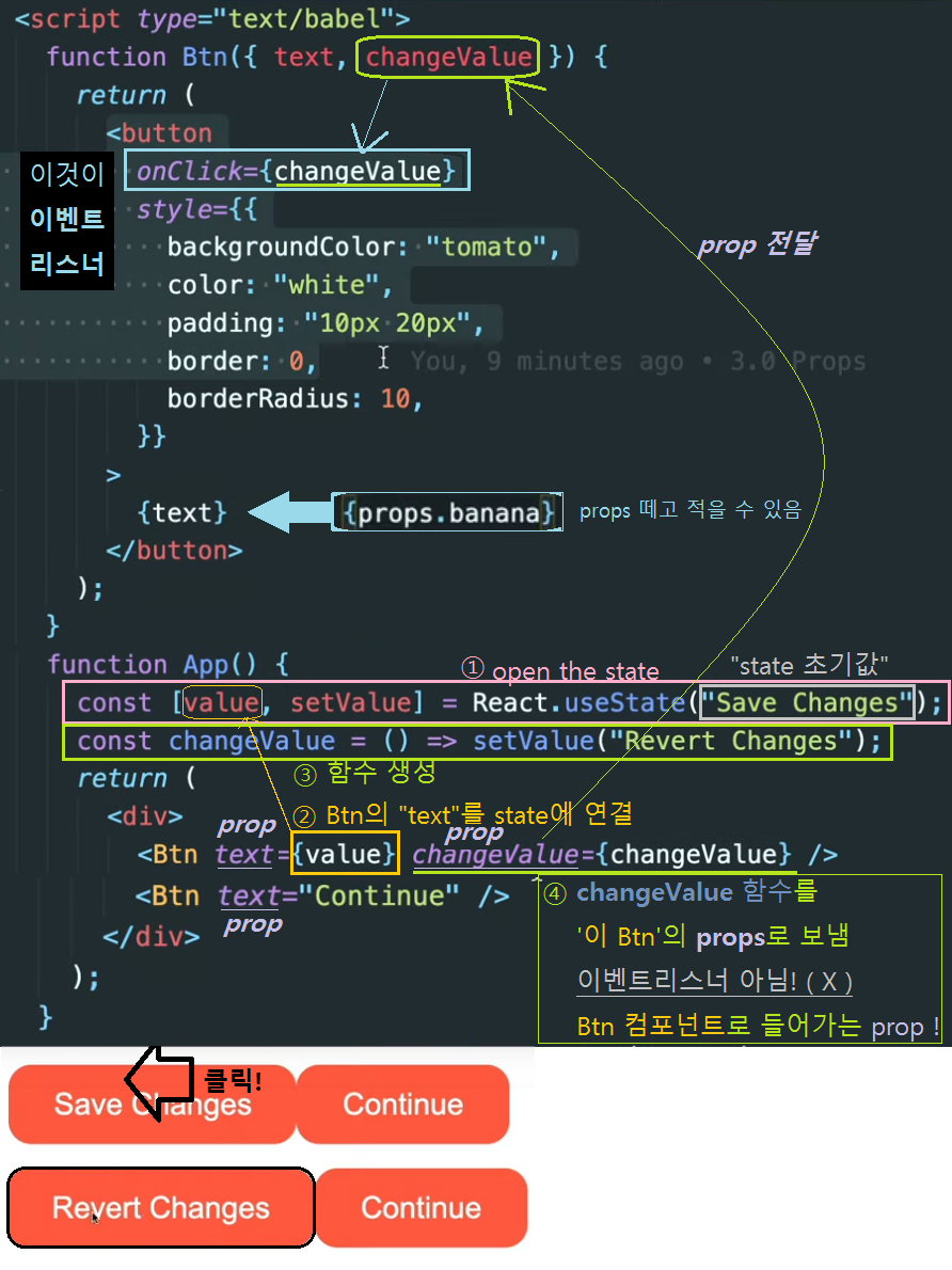 '인자(props)' 를 통해 정보( 문자열 "Save Changes" "Continue" )를 전송!