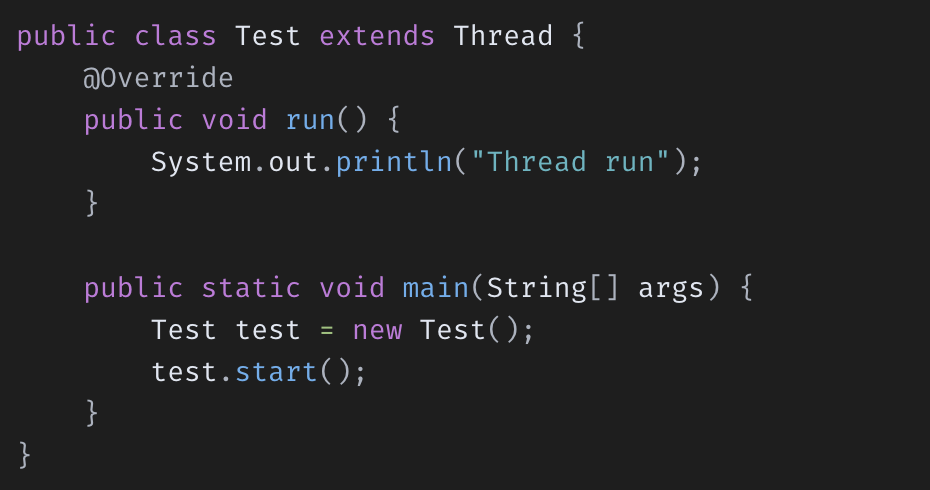Thread 클래스를 상속받은 클래스에서는 이 run() 메서드를 오버라이딩하여 사용해야 한다.