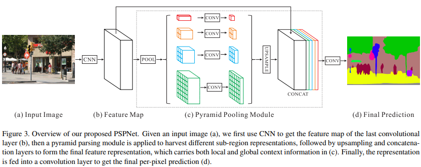 First, the model extract feacture model with Resnet. After then, it use pyramid pooling module to gather context information. Then, the model concatenate the prior with the original feature map.